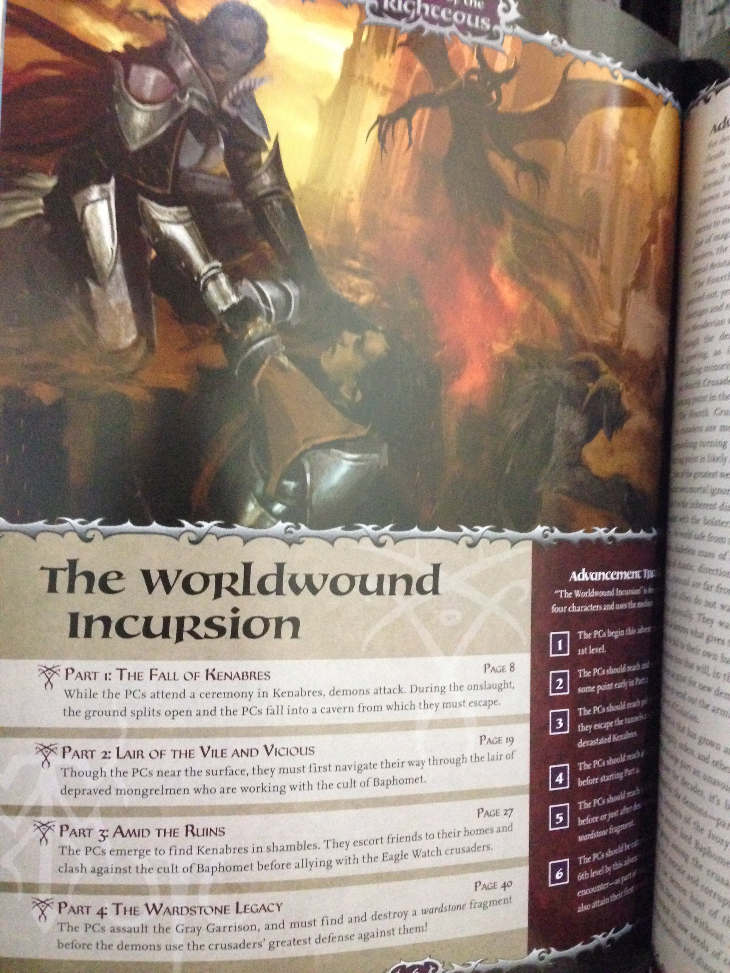 A partir de então podemos sentir o peso e a grandiosidade de Wrath of the Righteous. Podemos imaginar que essa missão não será nada fácil… O nível desta nova adventure path é tão alto, que Amber E. Scott concede, aos que se atreverem a jogar a aventura, uma gama de NPCs para auxiliar os personagens dos jogadores. A aventura ainda leva os jogadores à combates em massa, ou melhor, contra hordas demoníacas que pretendem invadir e subjugar Golarion. E não à toa, esta é a adventure path que reunirá a maior quantidade de suplementos para ser jogada de acordo com o escrito pela autora.